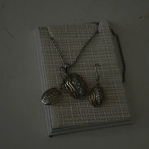 Hopeinen kaulakoru ja korvakorut alkuperäisessä rasiassa,vähän käytetyt. Toisesta korvakorusta puuttuu taustapala ns.perhonen. Ketjun kokonaispituus 36 cm.