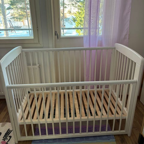 Neljäskin laita on tallessa joten voi käyttää alkuun pinnasänkynä ja sen jälkeen juniorisänkynä ottamalla laidan pois.