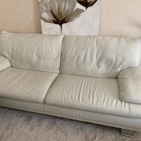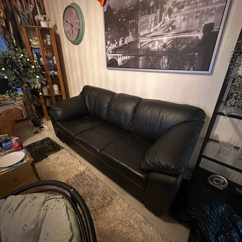 Kuin askosta tai sotkasta! Keinonahkainen 3-istuttava sohva mustassa värissä. Sohvassa on kolme erillistä istuintyynyä ja selkätyynyä sekä metallijalat. Kuvissa näkyy joitakin kulumia ja pieniä vaurioita verhoilussa. Sopii olohuoneeseen tai muuhun oleskelutilaan istumapaikoiksi useammalle henkilölle.