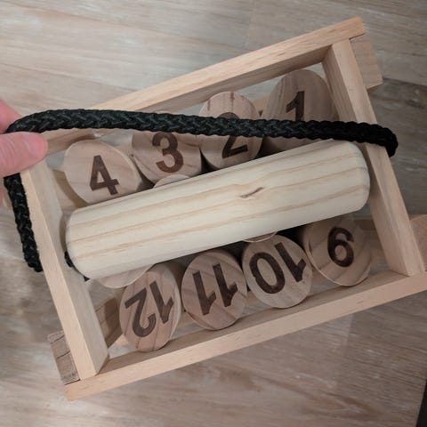Puinen mölkky-peli numeroiduilla keiloilla ja laatikolla