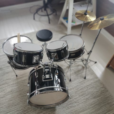 Millenium rumpusetti, jossa useita tomeja, virveli, bassorumpu sekä symbaaleja. Väriltään vihreä. Sopii esimerkiksi harjoitteluun ja bändisoittoon. Setissä on perusrumpujen lisäksi telineitä ja pedaali, kuten kuvassa näkyy.