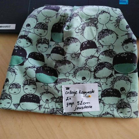 Uusio kangaista ( vanhasta uutta) ommeltu pip. Päällinen neulosta vuori triikota. Pesu; +40ast.konepesu. Koko 55cm joustava. Hp. 5€ +pk