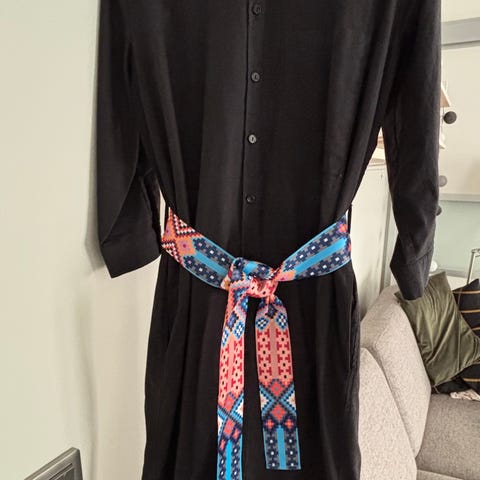 Halo from north- pellavamekko erinomaisessa kunnossa. Mekossa on napitus, samasta kankaasta tehty vyö sekä taskut. Koko on 36. Kuosi on taiteilija Reidar Särestöniemen maalauksesta innoittama.