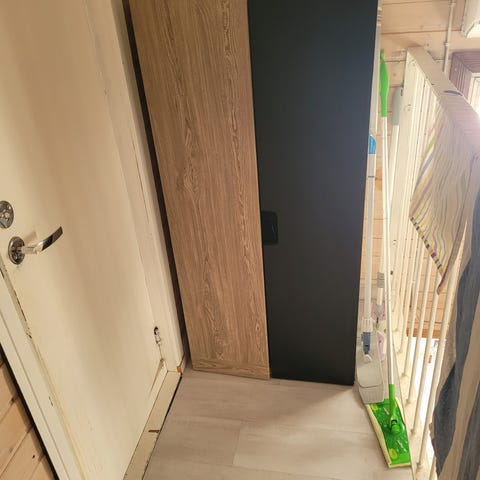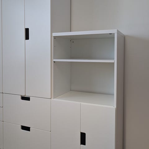 IKEA:n Småstad / Platsa vaatekaappi, jossa yläosassa kaappi hyllyillä ja alaosassa ulosvedettävä osa ripustustangolla, koukuilla j peilillä. Rungon väri on valkoinen ja ovet korkkia mihin voi kiinnittää lapselle tärkeitä juttuja.