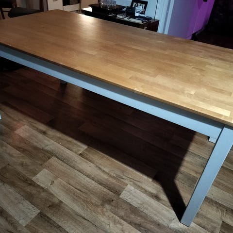 Myydään iso tukeva ruokapöytä pois uuden tieltä. Pöydässä näkyy elämisen jälkiä sivussa, mutta kansi on siisti. PAINAVA