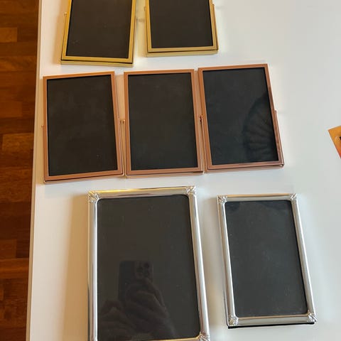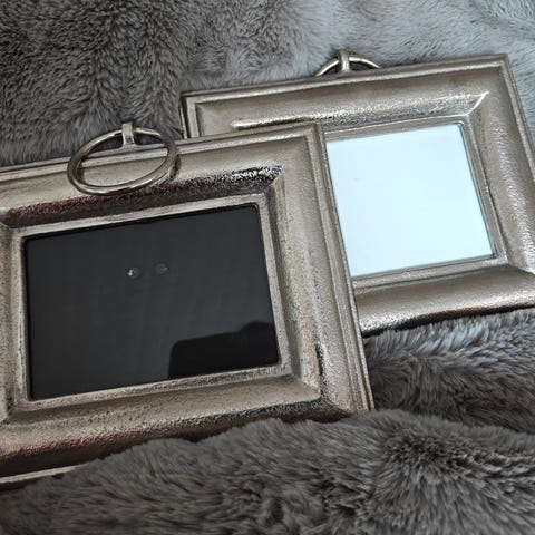Koristeelliset valokuvakehykset hopeanväristä metallia. Kaksi kehystä, molemmissa aukko noin 4x6 tuuman valokuvalle. Kehyksissä on runsas, ornamenttinen reunus ja ne sopivat esimerkiksi pöydälle tai hyllylle esille laitettaviksi. Soveltuvat valokuville tai pienille taidekuville sisäkäyttöön. Settiin kuuluvat molemmat kehykset.