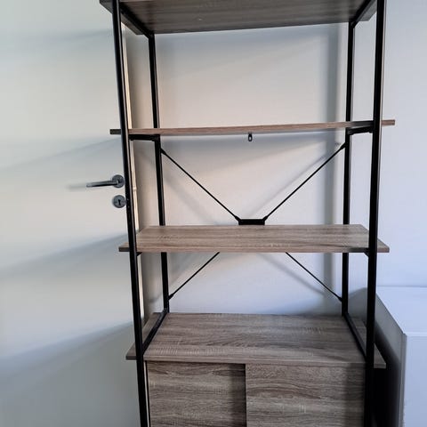 Puunvärinen kirjahylly, jossa on avohyllyjä, lasiovellinen vitriinikaappi sekä alakaapit ja vetolaatikot. Yläosassa useita hyllytasoja kirjoille ja muille tavaroille. Toisessa yläosassa on lasiovet, joiden takana hyllytilaa. Alaosassa vasemmalla kaappi ovilla ja oikealla vetolaatikoita säilytystä varten. Sopii esimerkiksi olohuoneeseen tai työhuoneeseen kirjojen, astioiden ja esineiden säilytykseen ja esillepanoon.