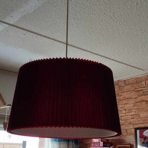 Muuton yhteydessä jäänyt muiden kattovalaisimien tieltä varastoon. Ollut siis katossa ja sitten varastossa eli oikein hyvässä kunnossa. Kevyt lamppu. Kupu 40cm korkea ja levein kohta noin 35 cm.