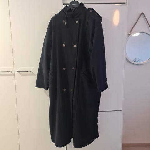 Ihana,beige villakangastakki irrotettavalla karvan hupulla.Pitkä malli.Kai-kai 59.Olka-helma 114.