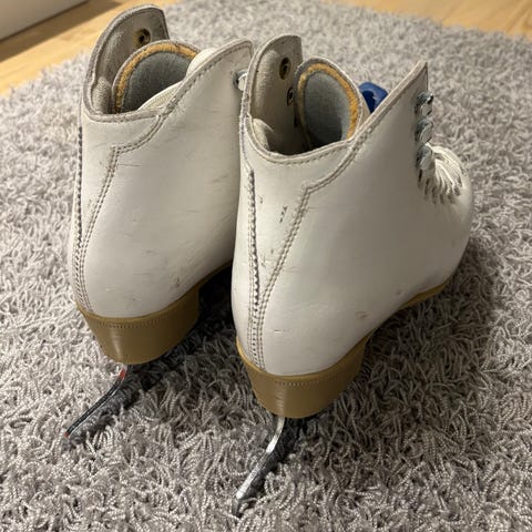 Lasten luistimet, koko 32. Väri valkoinen punaisilla yksityiskohdilla. Nauhakiinnitys ja lämmin, pehmeä vuori varressa. Terät teroitettu vuosi sitten. Pohjalaisen pituus on 21 cm.