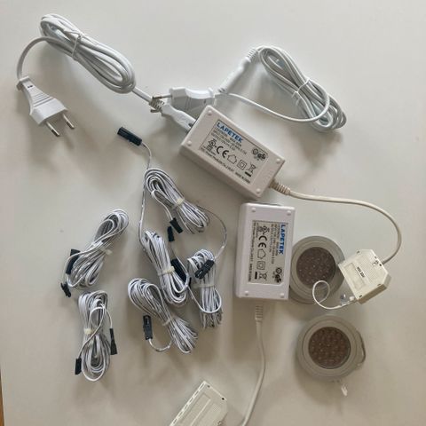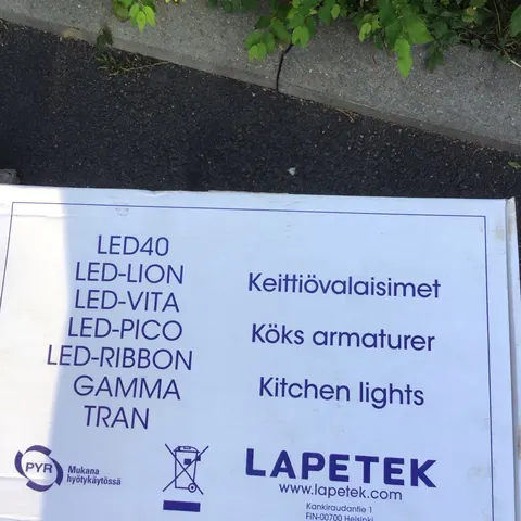 Lapetek Gamma keittiövalaisinsetti. Paketissa on useita pyöreitä valaisimia johdotuksineen sekä käyttöohjeet. Valaisimet on tarkoitettu kiinteään asennukseen esimerkiksi keittiön kaapistojen alle tai sisälle. Mukana on Sylvania Micro-Lynx F 6 W -lamppuja, jotka sopivat valaisimiin. Setti sisältää jakorasian ja virtajohdon kytkentää varten. Tarkemmat asennus- ja käyttöohjeet löytyvät mukana tulevasta ohjeesta.