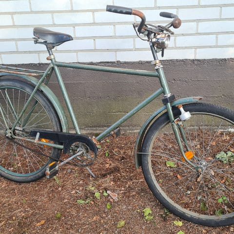 Armeijapyörässä on kaikki tarvittava - armeijan ohjaustanko, jossa hihnat, jämerä tavarateline retkeilykäyttöön, seisontatuki, edessä ja takana led-valot ja toimiva soittokello. Takana aito joukko-osaston heijastinkilpi. Renkaat ovat hyväkuntoiset, etupyörässä valmiina hyvä Nokian nastarengas (myös kesärengas mukaan).
