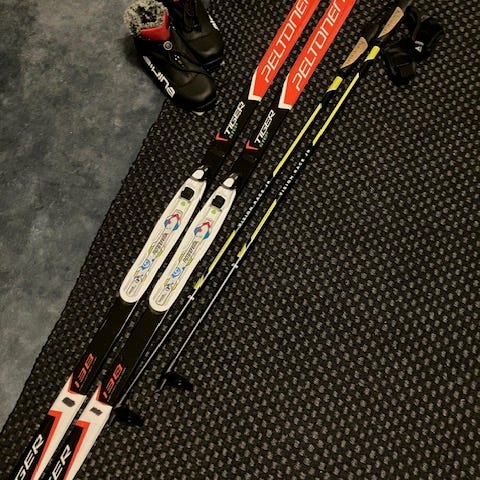 Muutaman kerran käytetty setti seuraavalle hiihtäjälle perinteiseen hiihtoon.