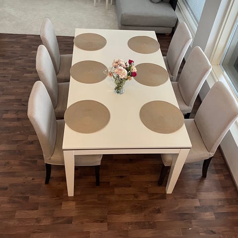 6 hengen ruokaryhmä, käytön jälkiä pöydässä ei suurempia. 2 tuolissa pupu käynyt nakertamassa saa kyllä piiloon jos viitsii jollain tuputtaa väriä