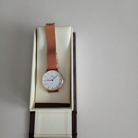 Daniel Wellington rannekkello, halkaisija 40mm. Väritys ruusukulta. Lasi lähes naarmuton, ranneke melko hyvässä kunnossa. Paristo vaihdettu juuri. Mukaan kuvassa näkyvät hilppeet.