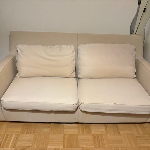 Istuinosan ja tyynyjen päälliset saa irrotettua ja pestyä. Sohva ja irtopäälliset on juuri pesty. Savuton talous, ei lemmikkejä. Istuintyynyjen alla pieni tahra (kts kuva), ei näy käytössä.