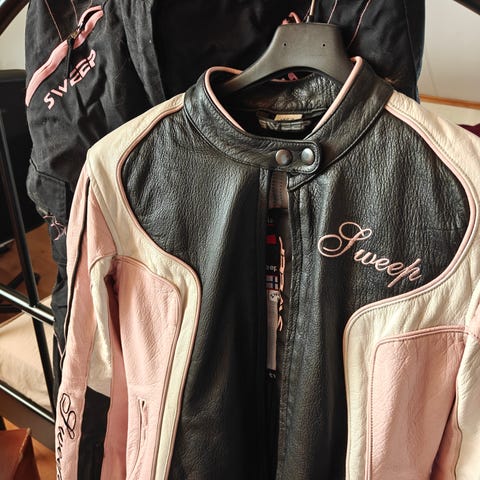 Naisten hyväkuntoinen ja siistissä kunnossa oleva ajotakki kyynärpää, olkapää ja selkä suojilla sekä lämpövuorella.