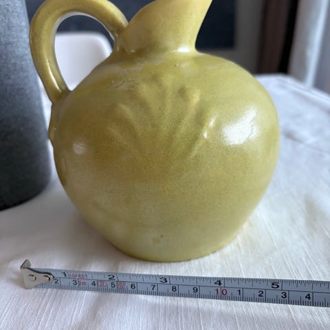 Keramiikka kannut ja maljakot. Kuvissa useita erimuotoisia ja -värisiä esineitä: sinisävyinen koristeellinen maljakko, punainen pyöreä kannu, vaaleanruskea korkea kannu sivukahvalla sekä matala valkoinen kaadin kukkakoristein. Yhdessä kannussa näkyy halkeama kahvan juurella ja pohjassa on leima tai signeeraus. Sopivat esimerkiksi sisustusesineiksi tai keräilyyn. Myydään yhdessä eränä kuvien mukaisessa kunnossa.