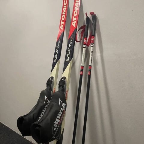 Hiihtopaketti 195 cm sukset, 42 koon monot ja sauvat