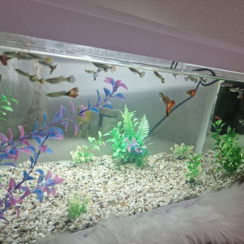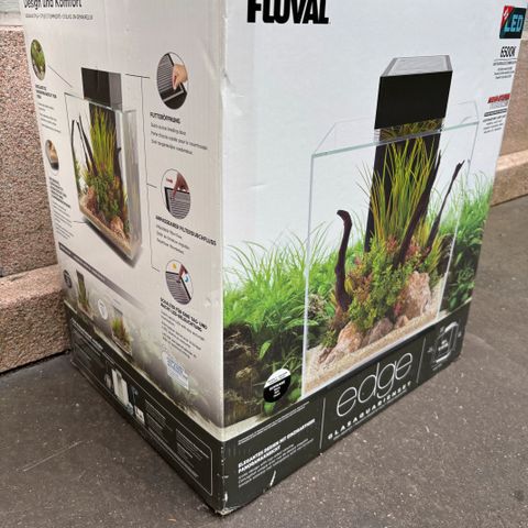 Lasinen suorakaiteen muotoinen akvaario. Akvaariossa on sora- ja kivipohja sekä koristeita, kuten silta ja putkikoriste. Varustukseen kuuluu suodatin ja lämmitin, jotka näkyvät akvaarion sisällä. Sopii makean veden kaloille tai muille vesieläimille. Soveltuu sijoitettavaksi hyllylle tai tukevalle tasolle. Tilavuus ei käy ilmi tarkasti, mutta akvaario on keskikokoinen–suuri kuvasta päätellen.