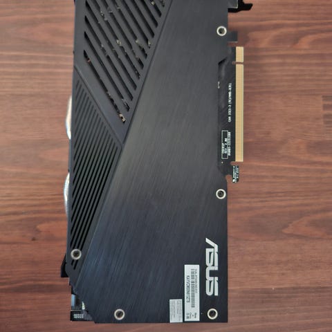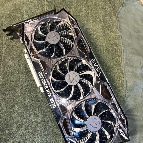 Tässä parin sukupolven takaisessa tehonäyttiksessä on järeä kolmen tuulettimen jäähy ja musta backplate. Virransyöttö tapahtuu 8- ja 6-pinnisten PCIe-lisävirtaliittimien kautta.