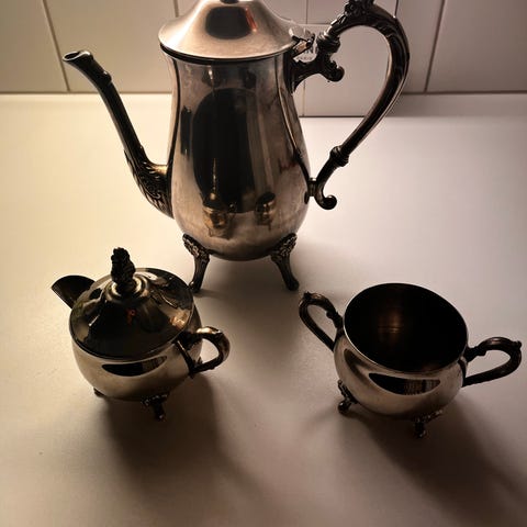 Hopeoitu kahvi- ja teekannu setti kuppeineen
