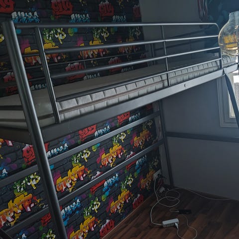Vuoden käytössä ollut korkea parvisänky+työtaso ja hyllyt. Ollut käytössä yhdellä lapsella. Sänky on hyvässä kunnossa. Pöytä tasolla pari pientä tyttären piirtämää jälkeä.