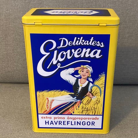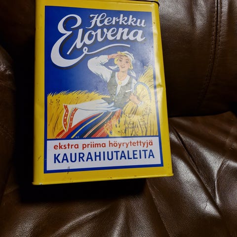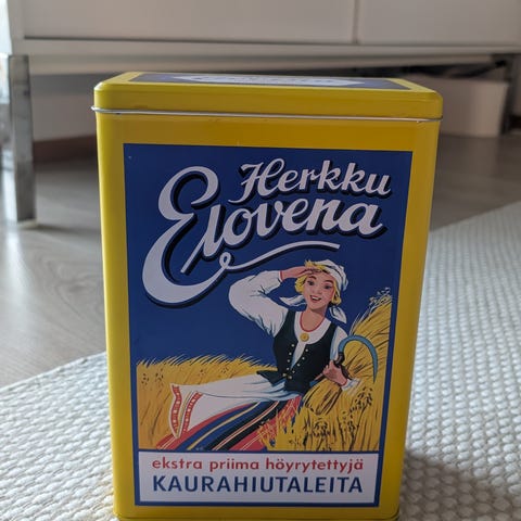 Kaunis 100 v juhlavuoden elovenan peltirasia kaurahiutalepaketille taikka pussipuuroille.