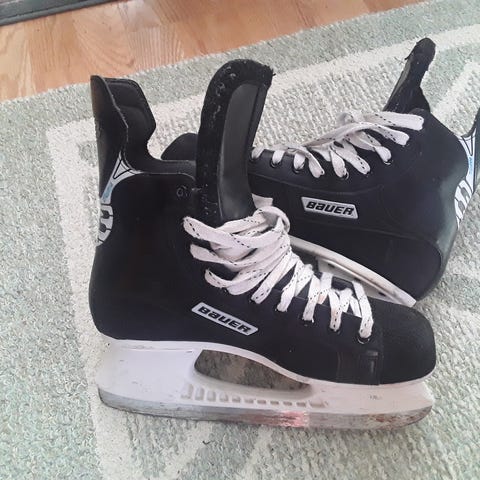 Bauer Professional jääkiekkoluistimet, koko 43. Väri pääosin musta valkoisilla yksityiskohdilla ja nauhoilla. Luistimet soveltuvat jääkiekkokäyttöön. Perinteinen nauhakiinnitys ja korkea varsi tukevat nilkkaa. Terät on valmiiksi asennettu runkoon. Koko vastaa noin EU 43 -kokoa aikuiselle tai nuorelle pelaajalle.