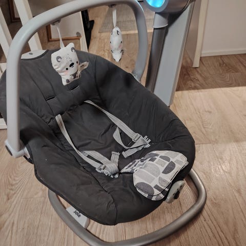 Joie serina 2 in 1 koliikkikeinu yövalolla. Sitteri käännettävissä ja irroitettavissa, soittaa tuutulauluja ja luonnonääniä. Sitterissä värinätoiminto 2 nopeudella värinä toimii pattereilla. Alustassa pieni halkeama joka ei vaikuta käyttöön. Vika huomiotu hinnassa.