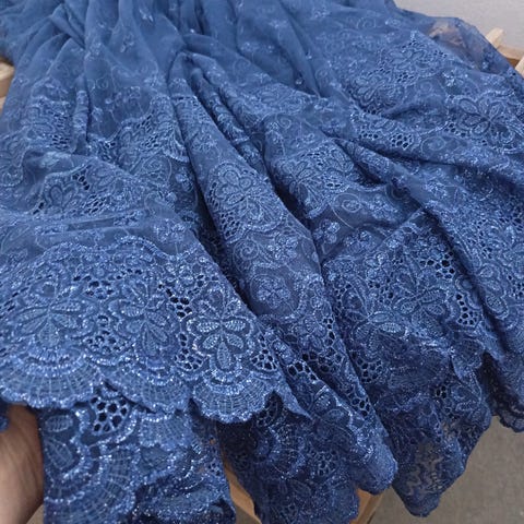 Shampanjan värinen pitsikangas, jossa tiheä kukka- ja koukerokuviointi sekä reunapitsi. Kangas on läpikuultavaa verkkopitsiä, johon on kirjailtu kukkia ja koristekuvioita. Sopii esimerkiksi mekkoihin, hameisiin, huiveihin, juhlapukujen yksityiskohtiin tai askarteluun ja sisustusprojekteihin, joissa tarvitaan kevyttä ja koristeellista pitsiä
