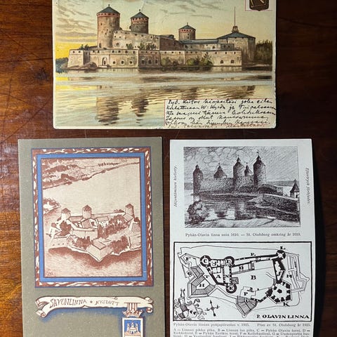 Tässä on monta 120 vuotta vanhaa postikorttia Olavinlinnasta. Kortit ovat 3 euroa kappale. Postimaksu on 2,75 euroa kirjeessä 50 grammaan asti. Sitä painavampi kirje on 5,50 euroa.