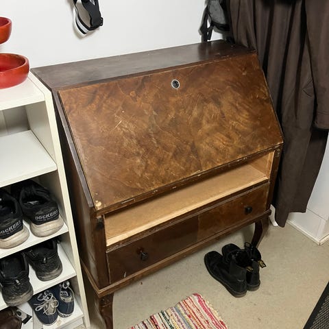 Annetaan muuton vuoksi vanha ja vähän rouheassa kunnossa oleva Klaffi-lipasto 60-luvulta. Kunnostamalla mahdollista saada upea lipasto, mutta me olemme käyttäneet ihan tämmöisenään. Pinnat täynnä vanhoja tarroja ja ylin laatikko liikkuu vain vähän kovemmalla voimalla.