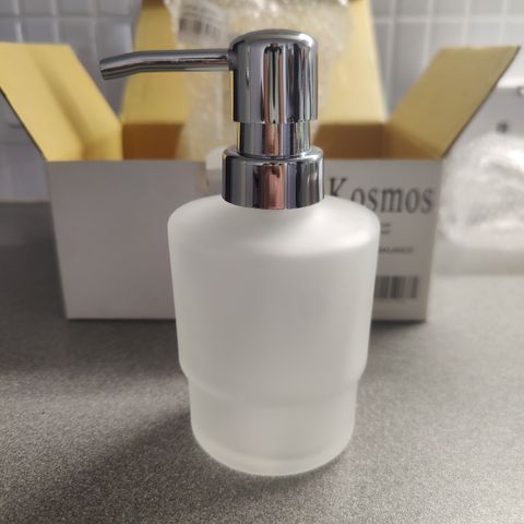 Uusi ja käyttämätön saippua-annostelija reiällä varustettuihin tasoaltaisiin. Pakkaus avattu vain kuvausta varten. Kuvassa tarkemmat tiedot. Mukana asennusohjeet.