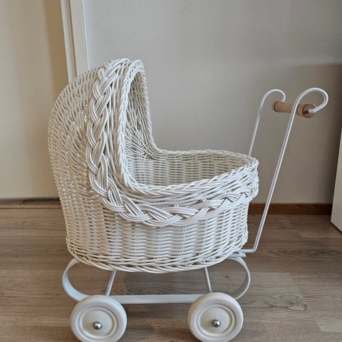 Lasten leikkivaunut, joissa vaaleansininen runko ja vaaleanpunaiset pyörät, kahva ja sisäosa. Vaunuissa on vaaleanpunainen kuomu kuviollisella kankaalla. Sopii nukkeleikkeihin ja muuhun roolileikkiin sisätiloissa. Vaunuissa on useampi pyörä, jotka tuovat tukevuutta työntämiseen. Kahva on mitoitettu lapsen kädelle.