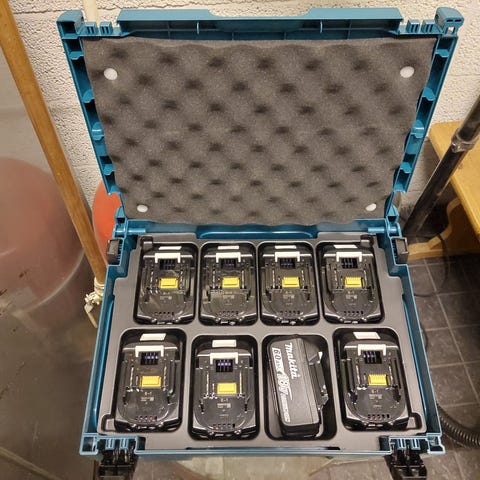 Makitan 18V LXT-sarjaa. Yhden ulkovaraston kattopellit ajettu eli muutama metri. Mukaan Makitan säilytyssalkku.