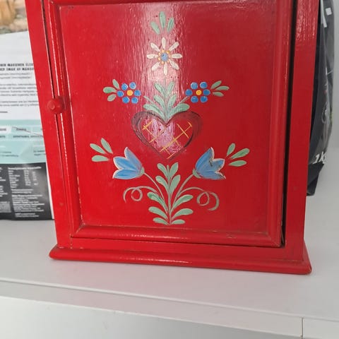 Pieni puinen avainkaappi seinälle, koko noin 20×29 cm.
