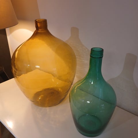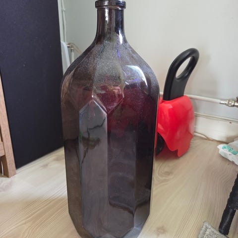 Kierrätetystä lasista valmistettu lasipullo. Pullo aikoinaan värjätty vihreäksi, mutta väri haalistunut.