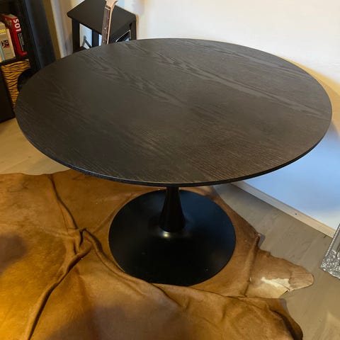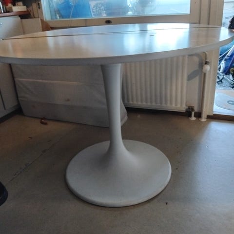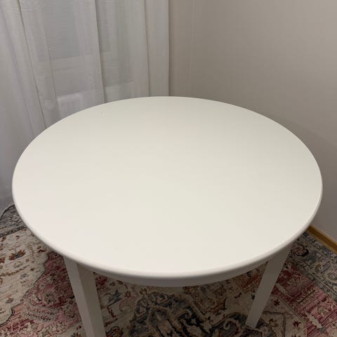 Myydään halk. 110cm ruokapöytä valkoisella kannella ja tammen värisillä jaloilla.