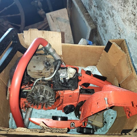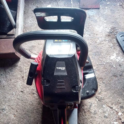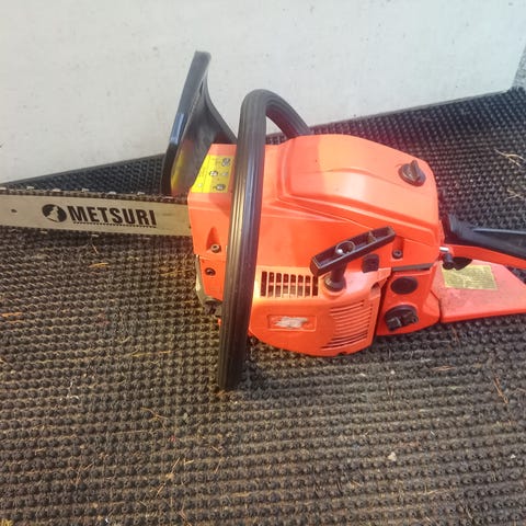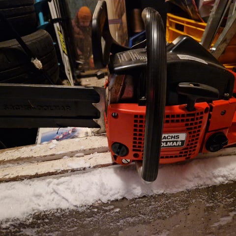 Lähti käyntiin. Terävarustusta ei ole. Ketjujarrua ei ole ja käynnistin vetää narun takasin välillä laiskasti. Ei pitäis olla kallis, tuukko hakee?