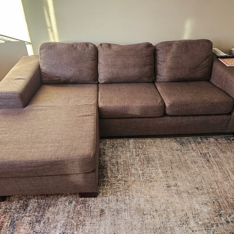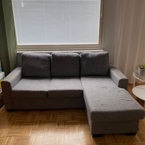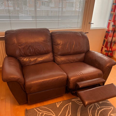 Annetaan iso nahkainen kulmasohva. Todella mukava istua.