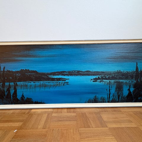 "Minä kuulin auringon huilun"-taulu. Korkeus 31,5 cm, leveys 23 cm, kehyksineen 41 x 33 cm. Nouto