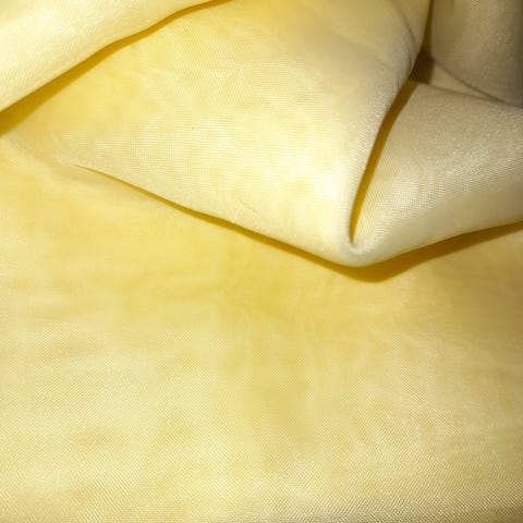 Keltainen verho, jossa tumma koristekirjailu ja aaltoileva reunus. Kangas on kevyt ja yksivärinen pohjaltaan, ja siinä on toistuva kirjailtu kuvio.