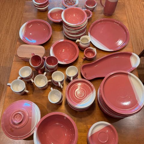 Isoja lautasia 7 kpl, syviä lautasia 6 kpl, leipälautasia 8 kpl, jälkiruokakulhoja 4 kpl ja ihana sydämen muotoinen piirakkavuoka.