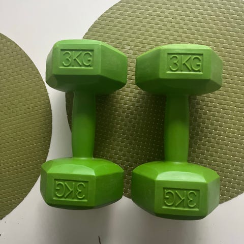 Käsipainot 4 kg, keltainen väri. Kuusikulmainen muoto ja neopreenipinnoite, joka parantaa otetta ja suojaa lattiaa. Sopivat lihaskuntoharjoitteluun kotona tai salilla sekä erilaisiin jumppa- ja kuntoutusliikkeisiin.