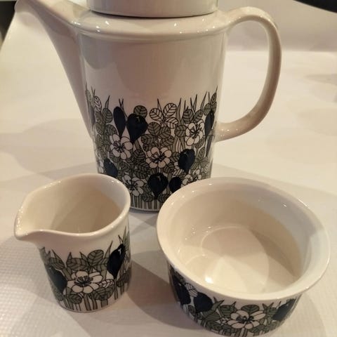 Kuvan virheeton Krokus kahvikannu ilman kantta.Kuvissa näkyvä valkoinen juova on valon heijastus eli kuviopinta on virheetön. Suunnittelija Esteri Tomula.