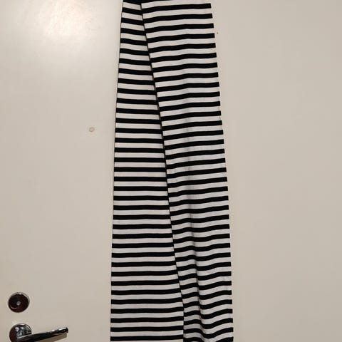 Marimekko mustavalkoinen tasaraitainen trikoohuivi.