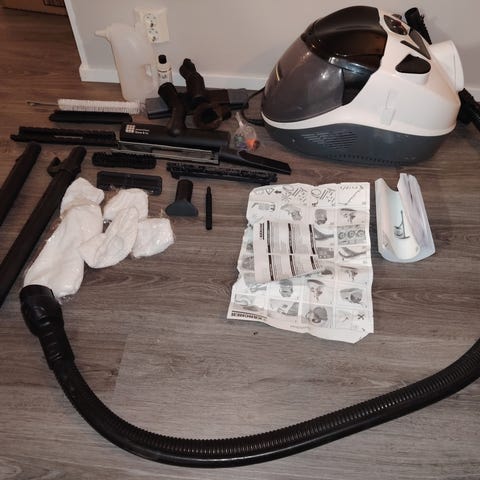 Hyväkuntoinen. 6 vuotta vanha, mutta käyttöä tullut vain kerran vuoteen, joten pääosin uudenveroisessa kunnossa. Liinoissa näkyy värjäymää käytöstä, mutta ovat ehjiä ja muuten hyväkuntoisia. Suuremman pyöreän harjasuuttimen harjakset ovat hieman kuluneet, mutta ei ole vielä haitannut käyttöä. Suuttimia on saatavilla myös varaosina.
