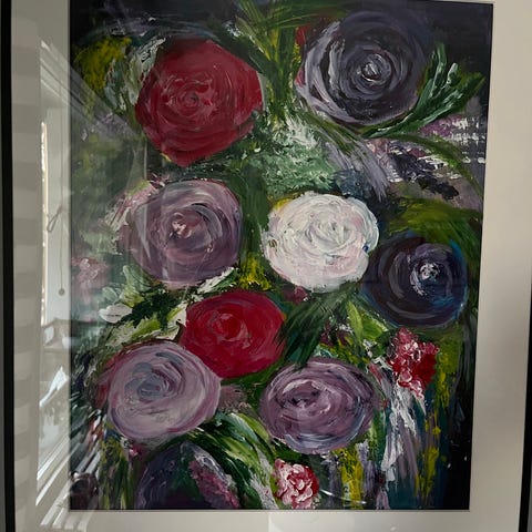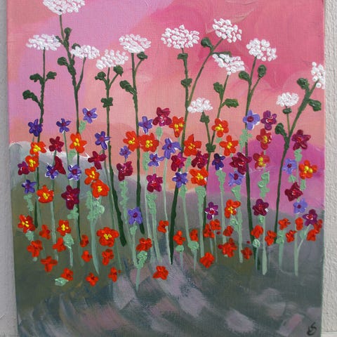 Abstrakti kukkamaalaus akryylitaulu sinisellä taustalla ja monivärisillä kukilla. Teos on maalattu paksulla, kolmiulotteisella tekstuurilla, jossa näkyy keltaisia, vaaleanpunaisia, violetteja ja sinisiä kukkia vihreää kasvillisuutta vasten. Taulussa on sinisävyinen, tähtitaivasta muistuttava yläosa ja kehys, joka on maalattu teoksen väreihin sopivaksi. Sopii seinälle sisustuselementiksi esimerkiksi olohuoneeseen, makuuhuoneeseen tai työtilaan. Materiaalina on kangaspohjalle tehty akryylimaalaus.
