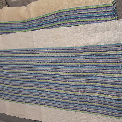 Reunoilla sivussa muutama reikä.Yläreuna neuloilla koottu,ei ommeltua kujaa.Hapsut osin kuluneet.
